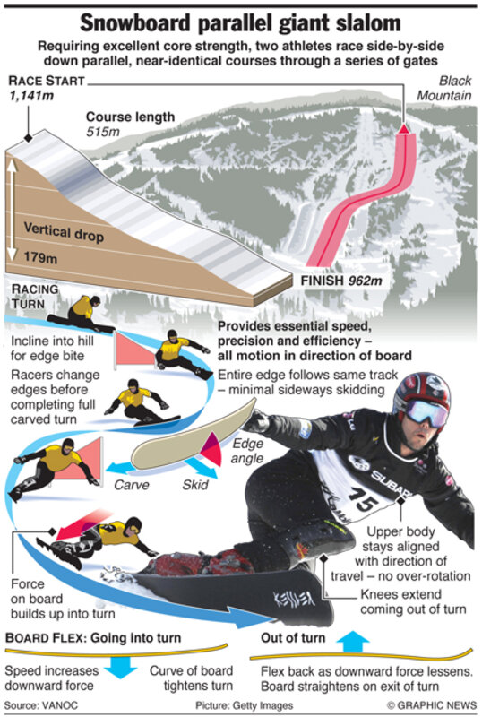 - Parallel Giant Slalom (): in an overall series of nine heats, snowboarders race in pairs down a gated course. The faster boarder advances to the next round.