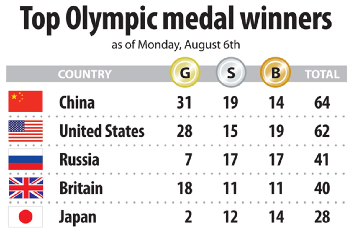 Monday was also a good day for the British. They held firm in third place with 40 medals total, 18 of them gold. The Brits picked up two more gold medals, one by cyclist , who won the men's sprint in track cycling. It was Kenny's second gold of the London Games, as he also picked up a gold with the men's track team in their sprint.