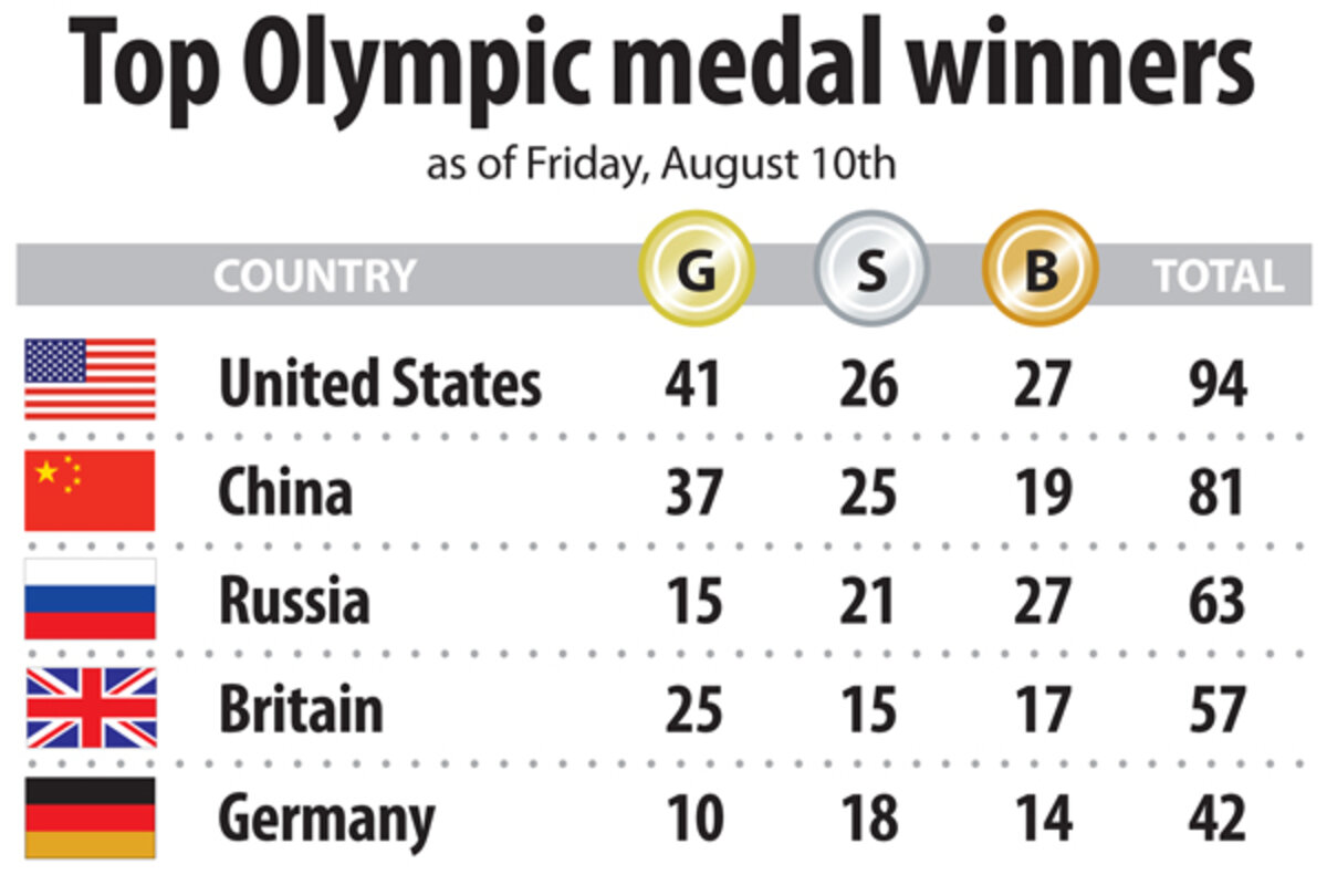 China, in particular, spreads out its medal totals. Its top two sports 鈥 swimming (10) and diving (9) 鈥 account for only 23 percent of its 82 overall medals.