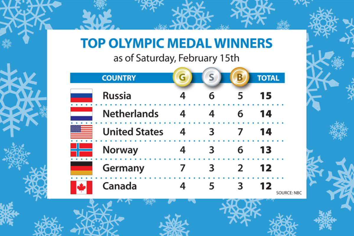 Russia now has 15 total medals, followed closely by the Netherlands and the US who have 14 each. Germany still holds the highest number of gold medals at seven.