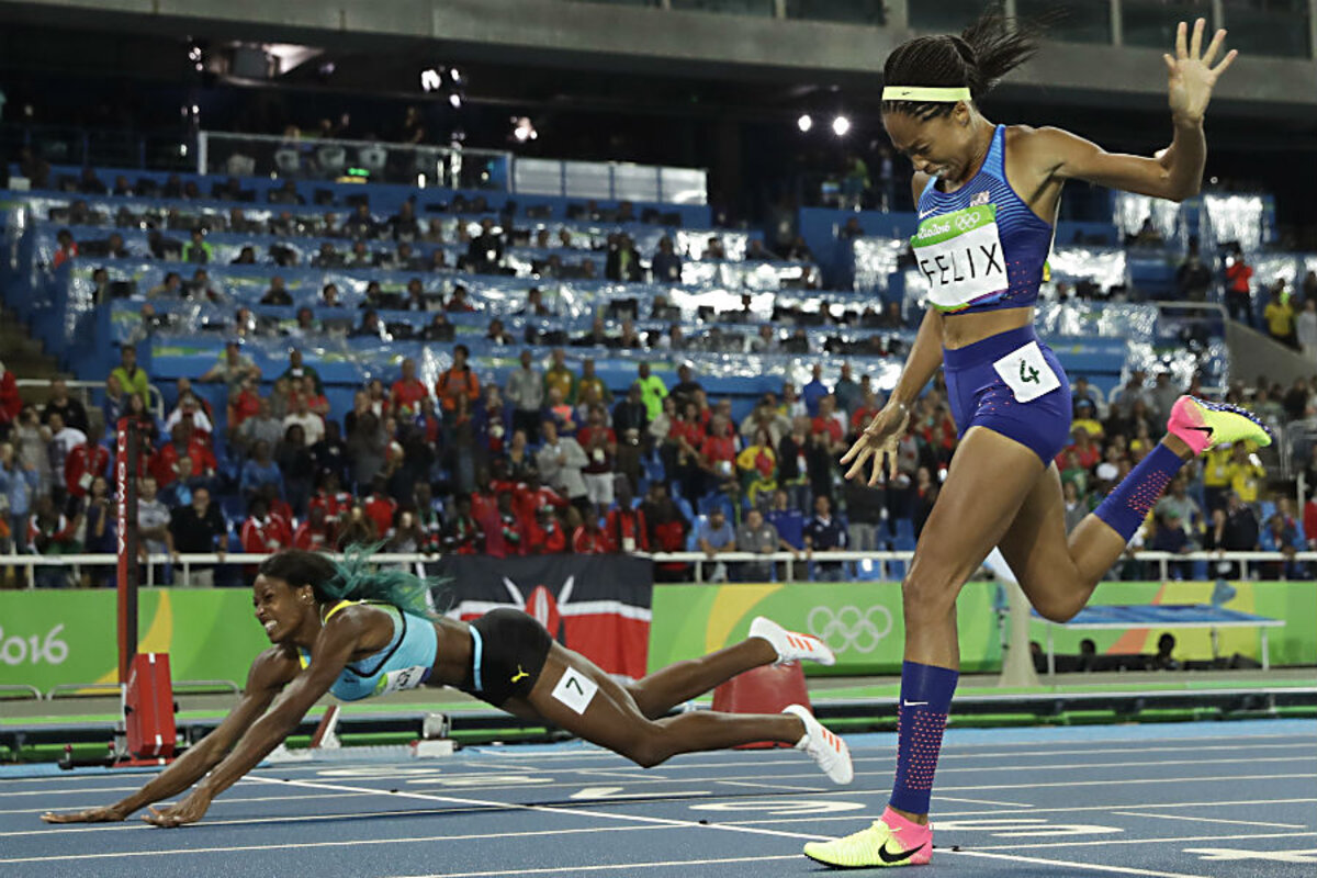 While Miller jumped with her arms flailing forward, the rules say the win is determined by which athlete has any part of her torso cross the line first. The photo finish showed Miller's shoulder barely beat Felix to the line.