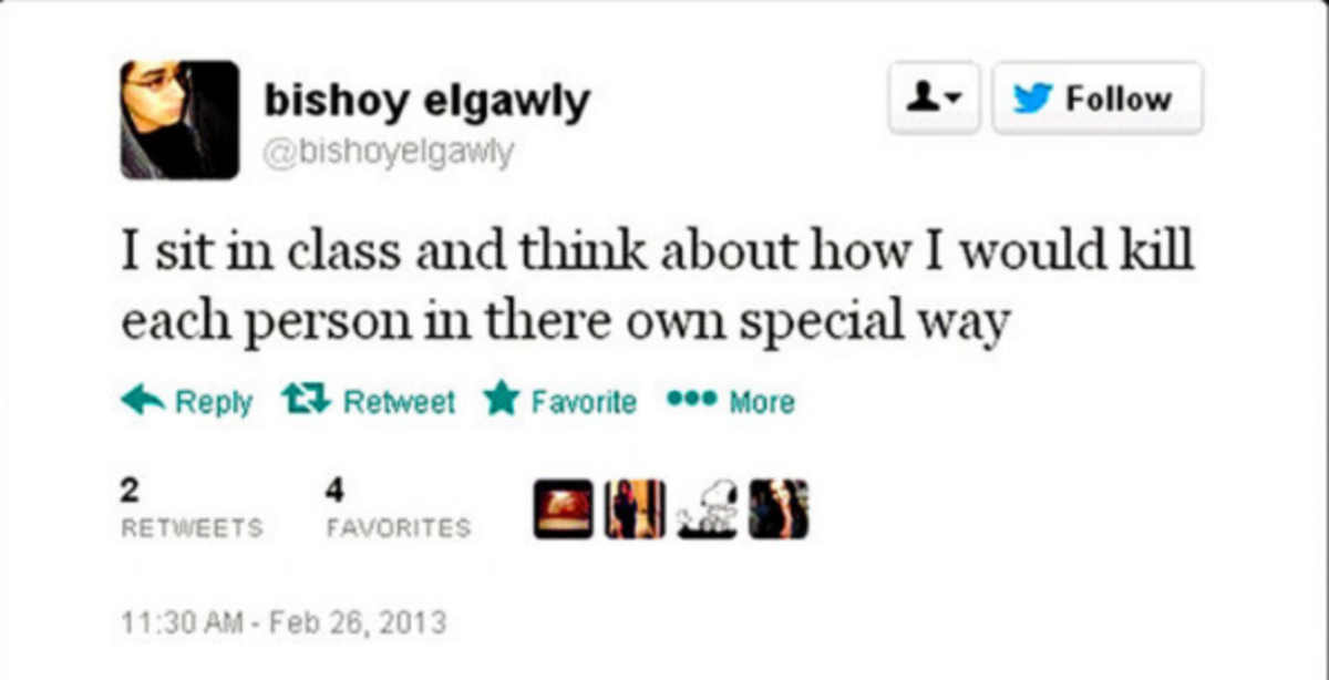 "I sit in class and think about how I would kill each person," the student听tweeted. Each person would die, he wrote, in their "own special听way."