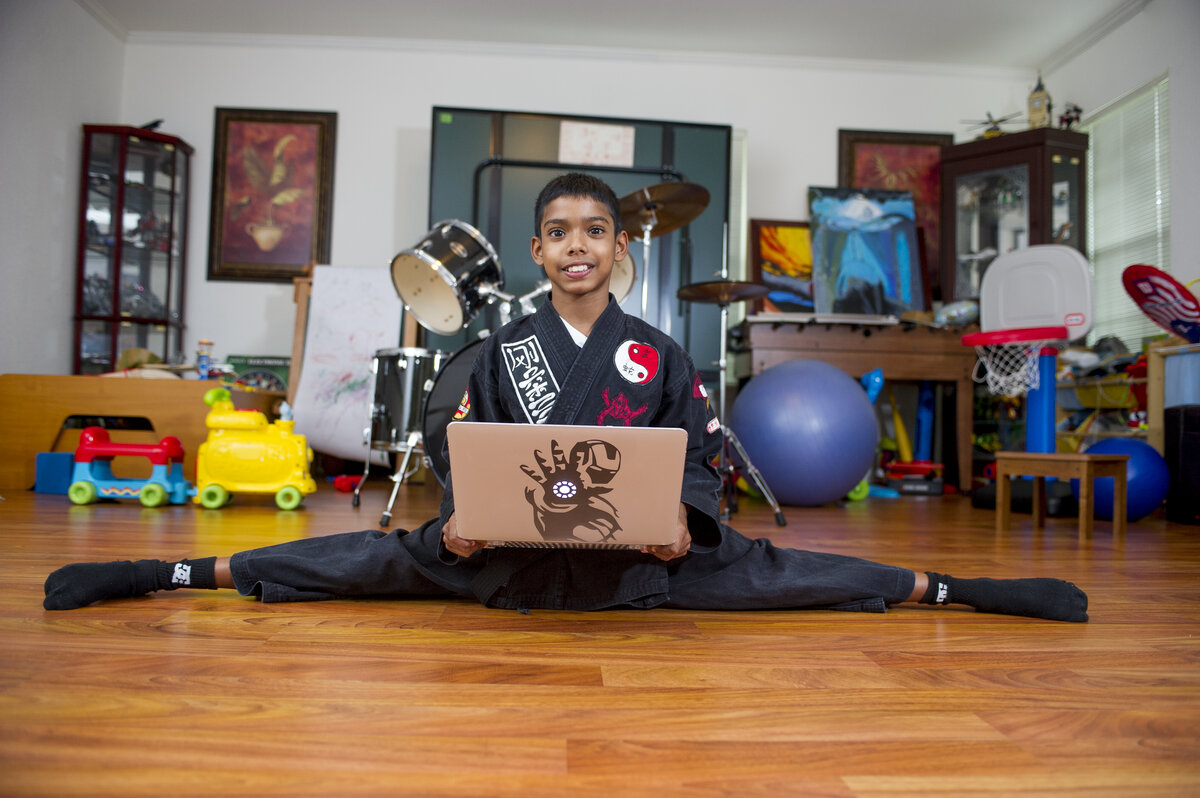 Something of a renaissance kid, who also competes in gymnastics and plays drums and piano, Reuben is so busy he does his homework for Harmony School of Science in the car. But he still makes time for video games.