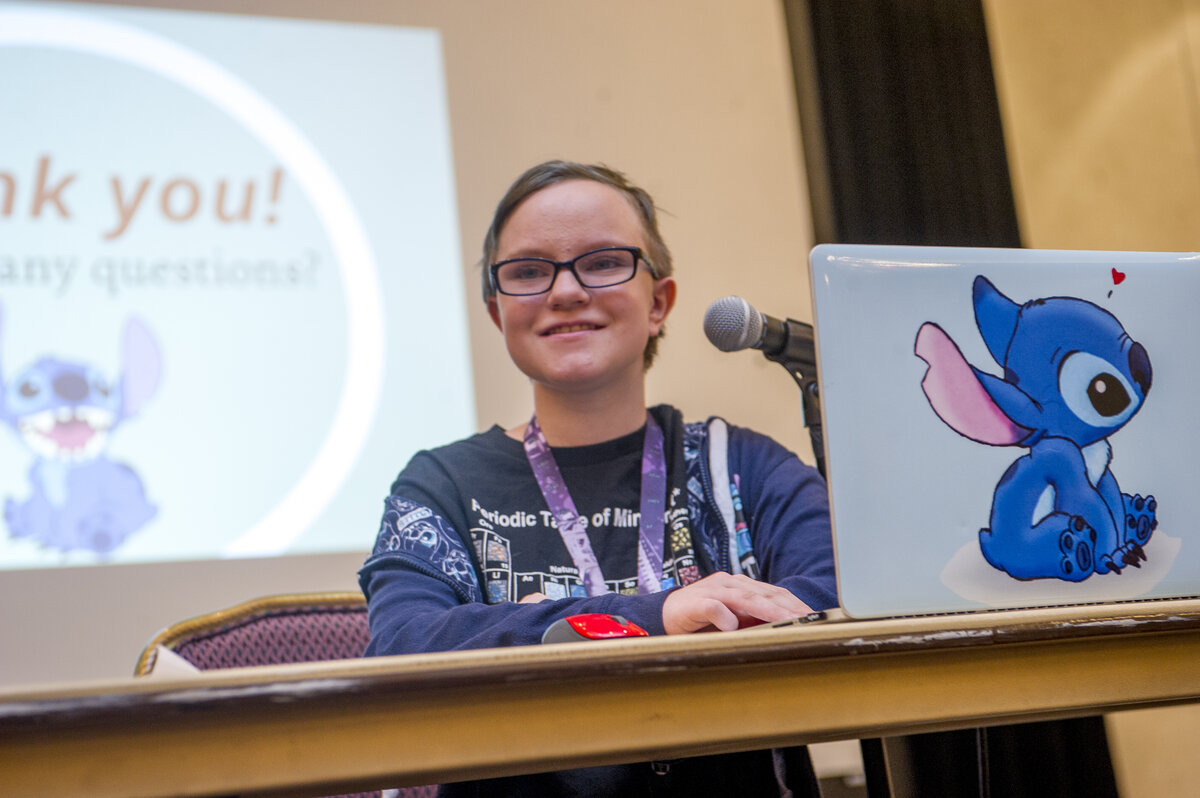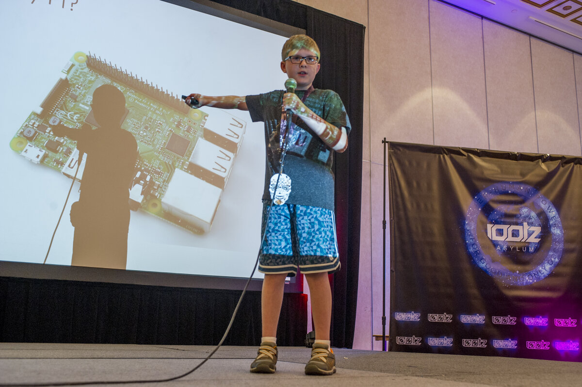Mollee McDuff, 13, kicked off this summer鈥檚 r00tz Asylum with her popular talk about video game to give players more resources in the virtual worlds they create. She walked through strings of code on stage from behind her Macbook Pro with a sticker of the big-eared, purple Disney creature that was the inspiration for her hacker handle Stitch.