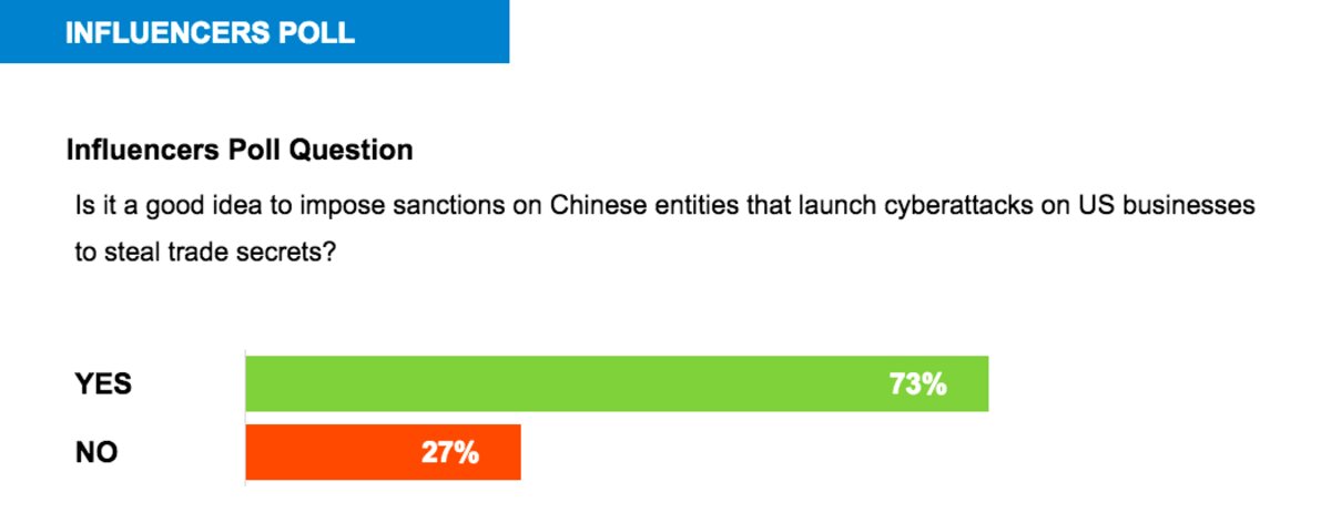 As Washington considers how to respond, 73 percent of Passcode鈥檚 Influencers said sanctions aimed at curbing China鈥檚 economic espionage would send the right听message.
