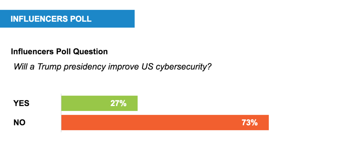 However, 25 percent of Influencers said they believed cybersecurity would improve under Trump. 鈥淵es, I think The Cyber will continue to enjoy more attention from both the executive and legislative branch under the new administration,鈥 said one Influencer who chose to remain anonymous. 鈥淐yber will be a priority issue for the Trump administration, and progress will continue, as it would had the election results been different,鈥 another Influencer added. 鈥淚t is a 鈥榤ust do,鈥 not a 鈥榥ice to do鈥 issue.鈥 Passcode allows Influencers to reply on the record or anonymously to preserve the candor of their responses.