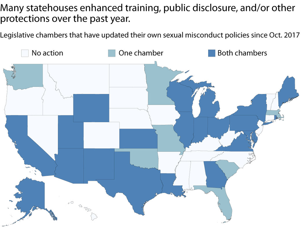 Above, see maps of progress showing which states are bolstering protections against sexual misconduct in statehouses since the start of #MeToo.