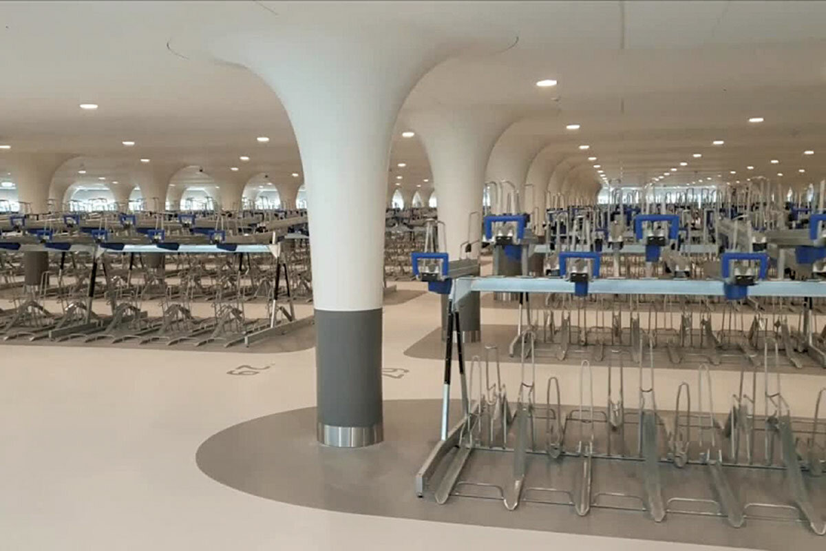 Art lines walkways and walls in the light-filled facilities, and curved surfaces are a tribute to the surrounding water. The two garages cost about 鈧85 million ($94 million).