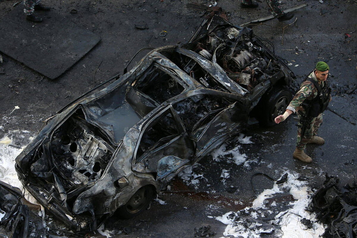 Mr. Chatah and his bodyguard died instantly, when a car bomb, estimated at around 110 pounds of explosive, detonated as his vehicle passed by. At least six other people died and dozens more were wounded in the blast, which could be heard across the Lebanese capital. Burning vehicles sent a thick column of black smoke billowing into the blue sky as ambulances and fire engines raced to the scene.