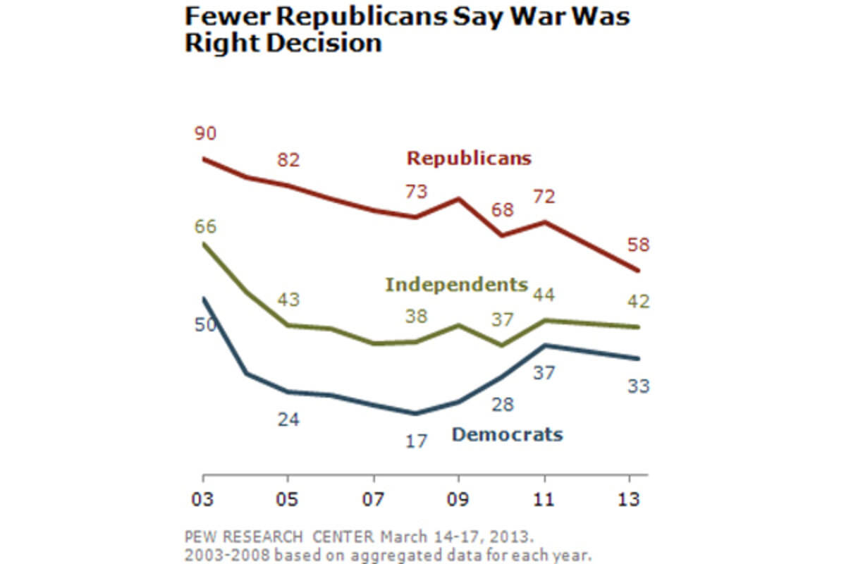 Today, 58 percent of Republicans say the invasion was the right choice (down from 90 percent a decade ago), 33 percent of Democrats (down from 50 percent) and 42 percent of independents (down from 66 percent). "So what," you might say. Republicans tend to be more hawkish and supported their team. But what's really eye-catching about support for the war is how Republican support has plunged since Obama took office and how Democrat support has... surged.