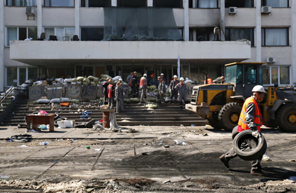 On Friday, several dozen workers, wearing overalls and safety helmets, were seen outside the government building, which the insurgents had abandoned, the Associated Press said. The workers were employed by Rinat Akhmetov, a billionaire industrialist who is one of Ukraine鈥檚 richest men and whose sprawling investments in the east employ tens of thousands of people. Mr. Akhmetov鈥檚 Metinvest holding company initiated the agreement on Thursday, along with police officials and community leaders, AP reported.