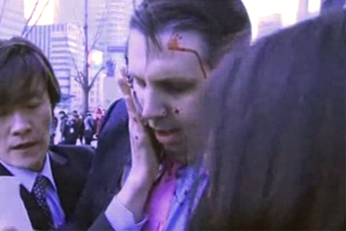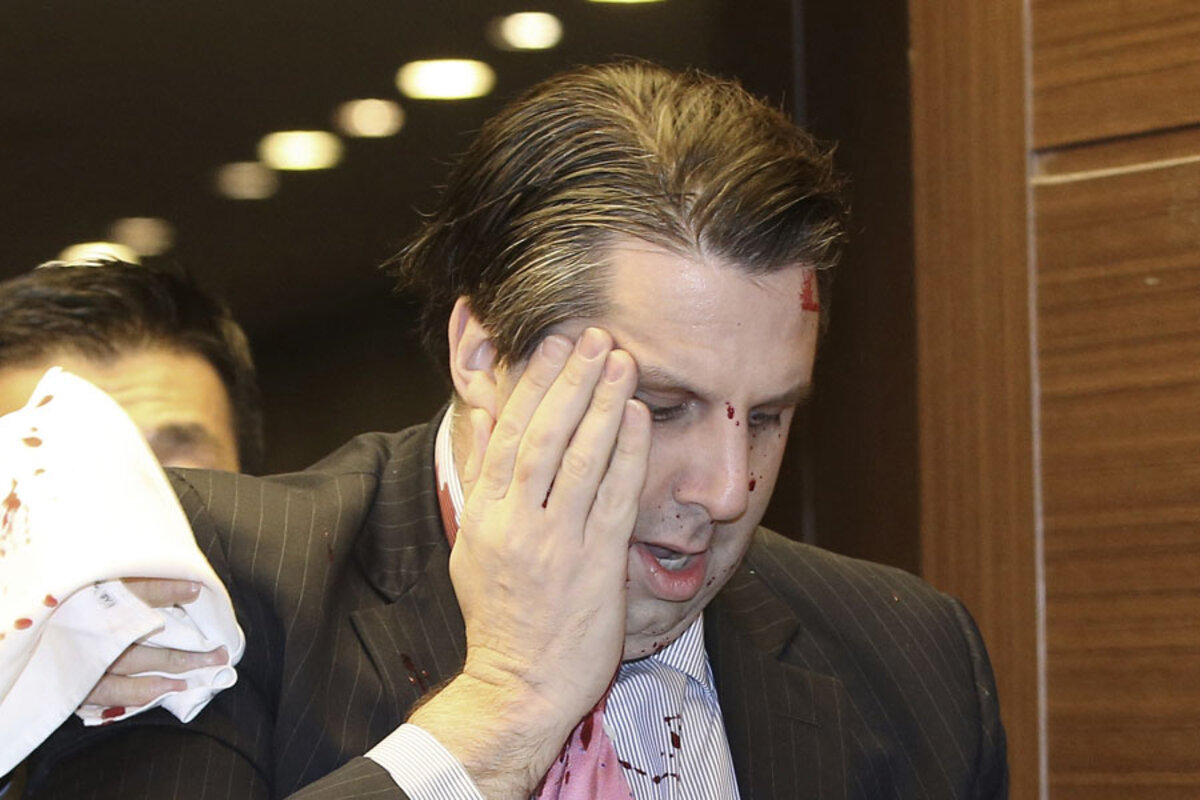 "The guy comes in ... He yells something, goes up to the ambassador and slashes him in the face," witness Michael Lammbrau of the Arirang Institute think-tank.