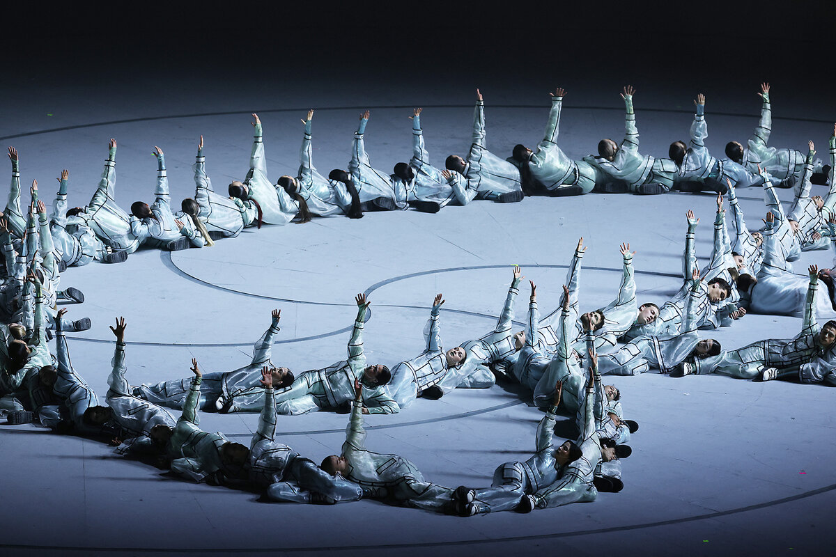 From the dances to the music to the fashion, the show was all Italy. Dancers draped in white and gold togas chasséd between marble busts reminiscent of iconic works. Paparazzi trailed a fashion model with a giant conductor’s wand, directing life-size bobbleheads of Italian composers. Giant tubes of paint spilled out sheets of silk in primary colors that were mixed and melded by dancers dressed in all the colors of a box of crayons. Even the tension in a choreographed dance, meant to represent the distance between urban life and the natural world, dissolved into an embrace beneath the golden Olympic rings.