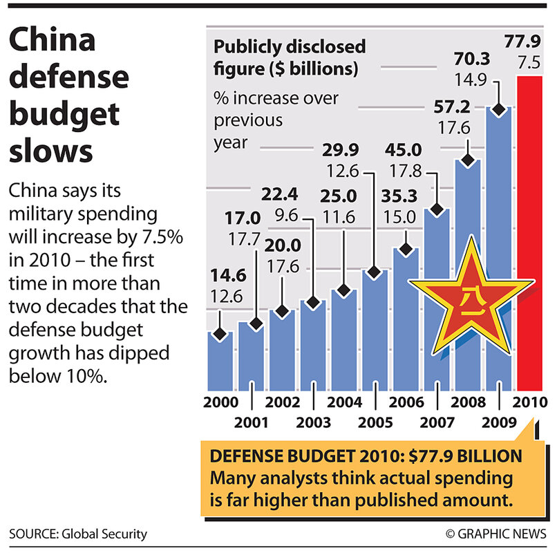 The Associated Press reports that parliament official Li Zhaoxing said this year鈥檚 budget increase, bringing expenditures to about $77.9 billion, will be used to 鈥,鈥 and that China鈥檚 military is 鈥渄efensive in nature." He said that China鈥檚 defense spending makes up 1.4 percent of its gross domestic product (GDP), while defense spending in the US is more than 4 percent of GDP and more than 2 percent in Britain, France, and Russia.