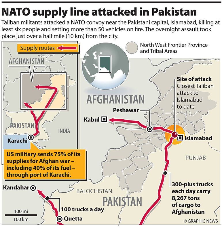 The Guardian reports that attacks on convoys further along the route, especially the restive northwestern city of Peshawar, have become in recent months thanks to military operations in the nearby Khyber and Orakzai tribal areas.