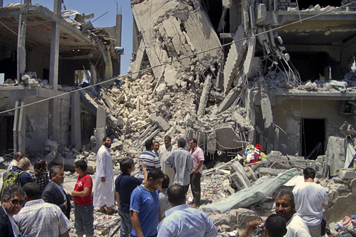 The Times reports that an angry crowd was gathered outside the building, and some witnesses said they heard aircraft before the building exploded around 1:15 a.m. Neighbors told the Times that there were no military buildings nearby, and that those reported killed were members of an extended family with the surname Gharari. The Times correspondent reported that the body of a woman was removed from the rubble, and authorities showed reporters five bodies, which they said were all casualties from the blast, at a Tripoli hospital.